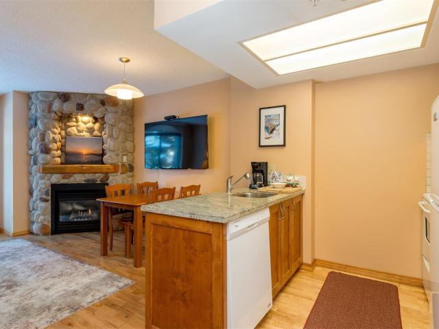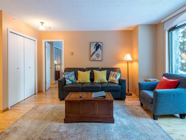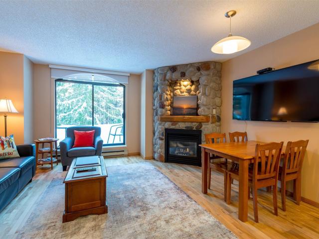 Newly upgraded furniture, furnishings, and finishes in this cozy 1-bedroom home is located in a quiet, concrete building slope-side to Blackcomb Mountain, with ski-in/ski-out access across the road. Features include a year-round heated outdoor pool, covered hot tub, sauna, exercise area, bike storage, ski storage and large party room. It is one block from The Fairmont Chateau Whistler Golf Course, and has easy access to The Valley Trail and Lost Lake's cross-country ski and bike trails. Located on the ground floor, enjoy large patio and private treed outlook, with fabulous natural light. Well-managed strata, parkade upgrade paid by sellers, this home has it all.