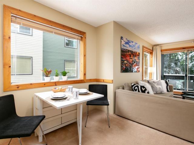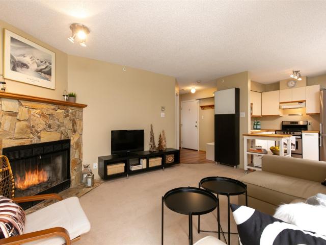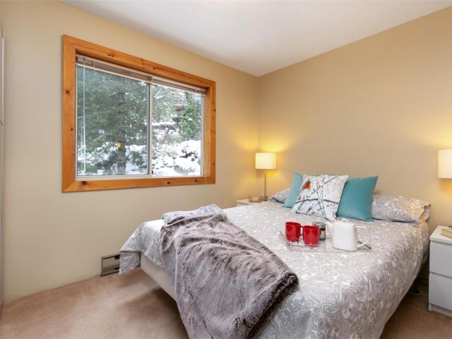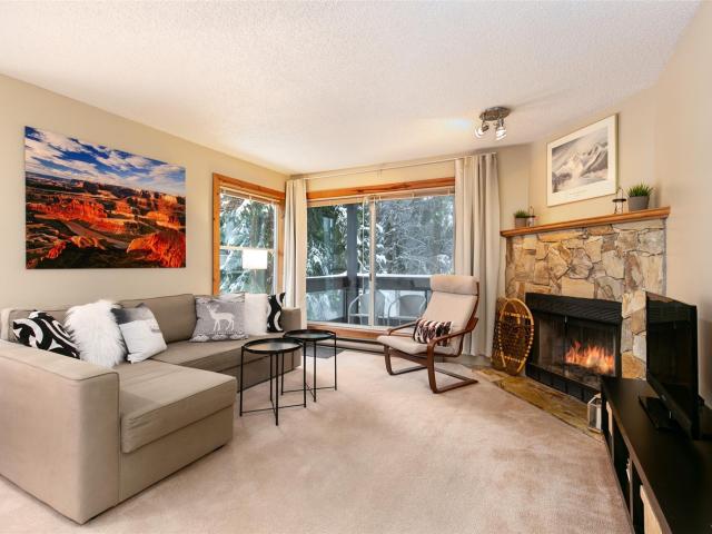 This bright, second level, corner suite is being sold fully furnished. Features a wood-burning fireplace, personal owner’s storage room with washer and dryer just outside the condo door, underground parking. Super quiet location with North facing garden and green space views from the living room windows and deck! 5 minute walk to the Whistler Creek base with all the amenities including ski gondola, shopping, dining, entertainment and more. This complex has one of the best run strata in Whistler. The upkeep of rock gardens, grounds and building maintenance is ongoing and very well managed. Flexible Phase I zoning allows unlimited personal use with the option of short (nightly) or long term (monthly) rentals. Powderview is the ultimate Whistler Creekside location. Best of all … GST is not applicable!