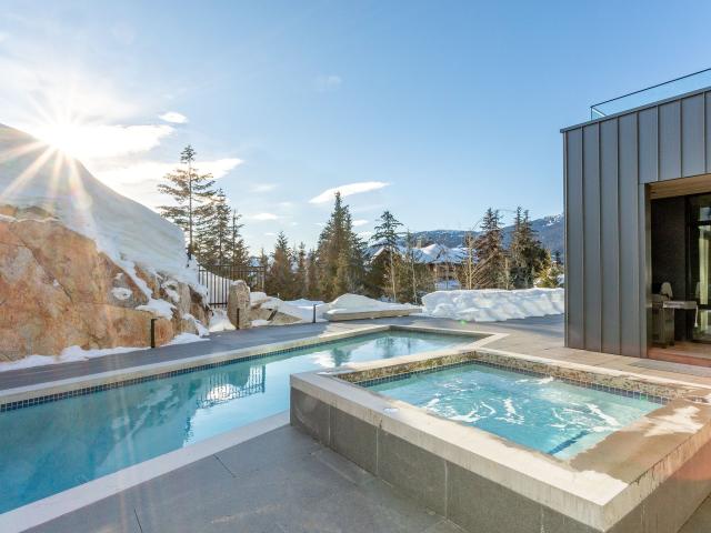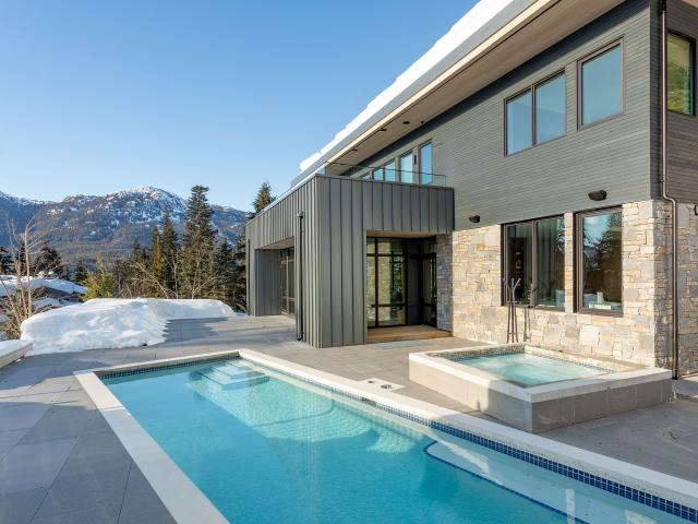 Merging contemporary design, quality craftsmanship, and awe-inspiring nature, this newly-constructed Kadenwood residence is the very best of high-end Whistler living. Expansive windows exhibit a spectacular setting: aligned against granite rock and old growth rainforest, with views over Whistler Peak and the Tantalus Range. Combined with outdoor living spaces, including heated patios, pool, and hot tub, this residence makes you feel truly immersed in nature. A thoughtful layout with multiple living spaces, including a media room, wine cellar and tasting room, make this the perfect home for hosting. TA rental zoning allows for nightly rentals. Complementing the surrounding beauty are features highlighting the attention to detail of renowned architect, Brent Murdoch, and craftsmen, Gavan Construction Ltd. An elevator services all levels; the chef’s kitchen features Gaggenau kitchen appliances; an oversized double garage with large ski/boot room ensures there’s space for everyone’s gear; and custom Shinnoki Oak millwork with Caesarstone quartz tops are used throughout. Located in the exclusive Kadenwood neighbourhood, this residence offers ski-in/ski-out access plus the convenience of a private gondola, and all within close proximity of Creekside and Whistler Village.