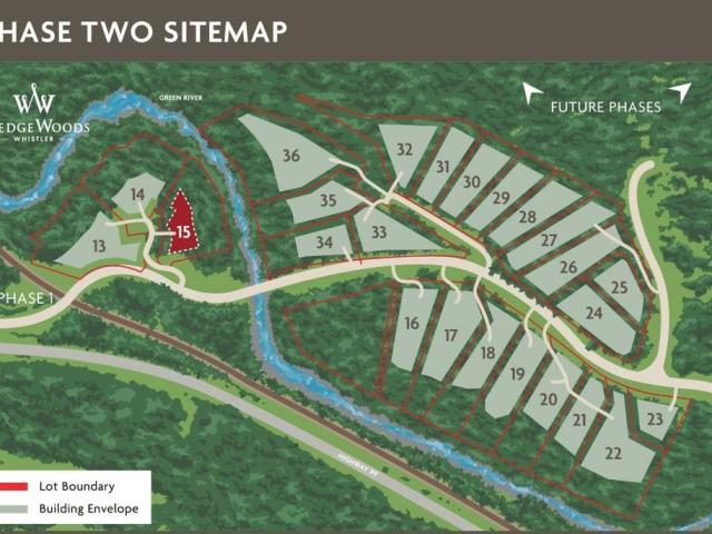 Wedge Woods is a private community consisting of 108 large estate lots with large building envelopes to allow incredible design opportunities. Lot 15 at Wedge Woods is one of a select few properties with frontage along the Green River and also with Southern exposures. The shape and topography of this property will allow for exceptional privacy and the ability to design something spectacular for your family at a fraction of the cost only 12 minute's drive from Whistler Village.