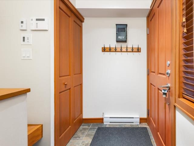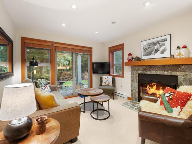 Beautifully updated and spacious 1-bedroom Treeline townhome, quietly situated on a private cul-de-sac in the Blackcomb Benchlands. Features heated slate floors, warm wood accents, wood-burning fireplace, and a large private patio with perfect for a BBQs overlooking a grassy yard. The kitchen includes solid pine cabinets, heated floors, and quality appliances. Treeline offers a ski-home trail, hot tub, secure underground parking with bike storage, and a private ski locker at the front door. Free public bus nearby. GST exempt.
